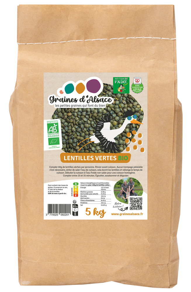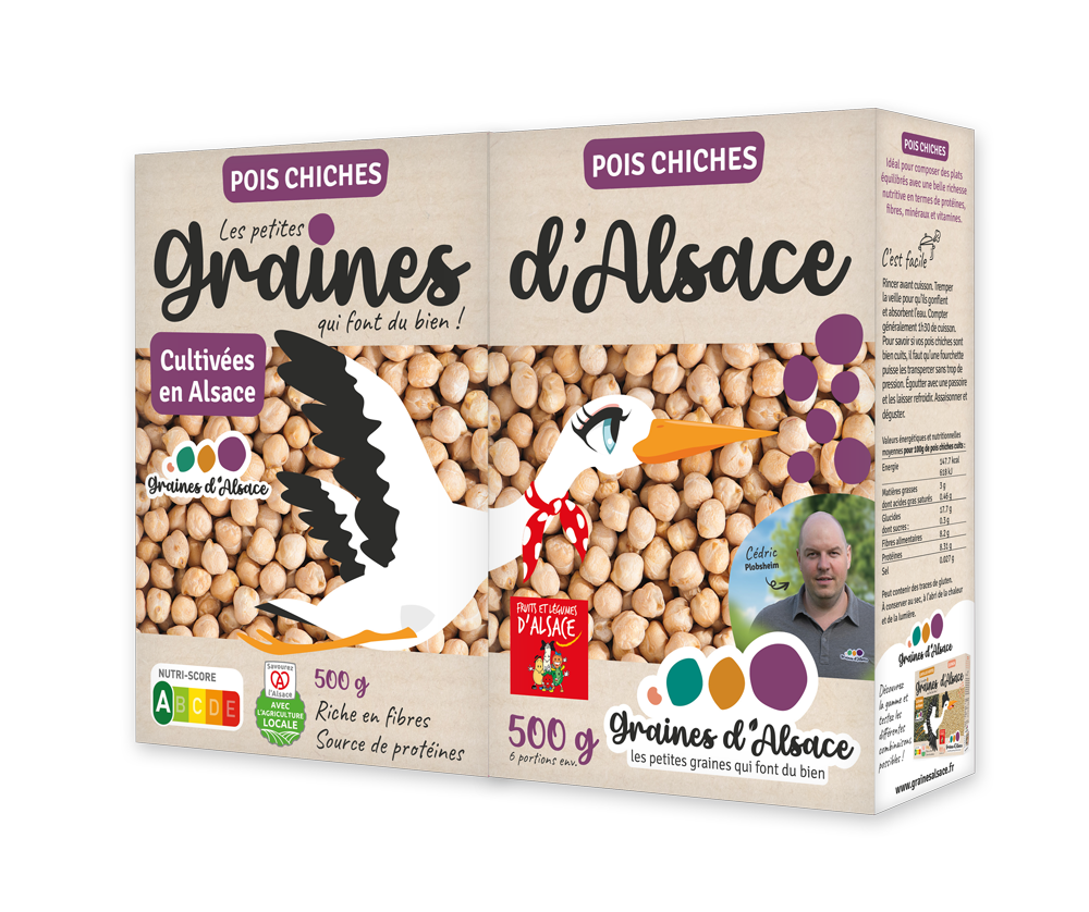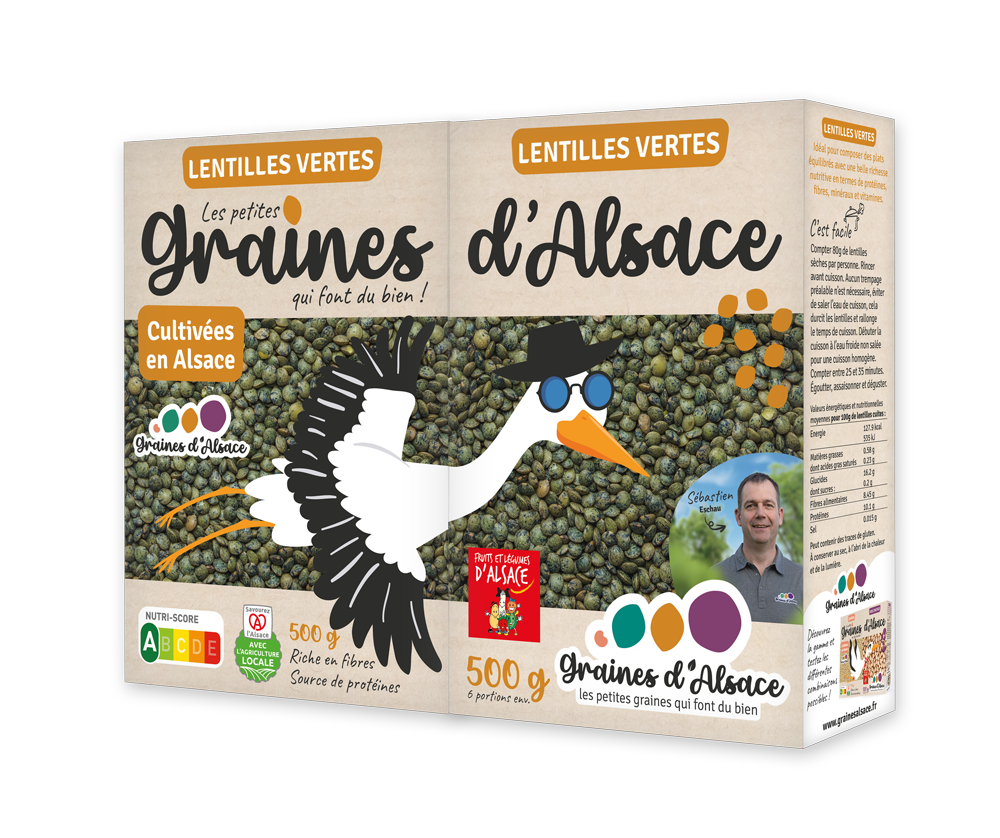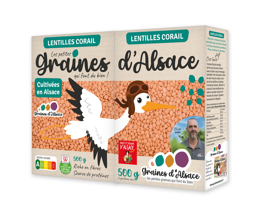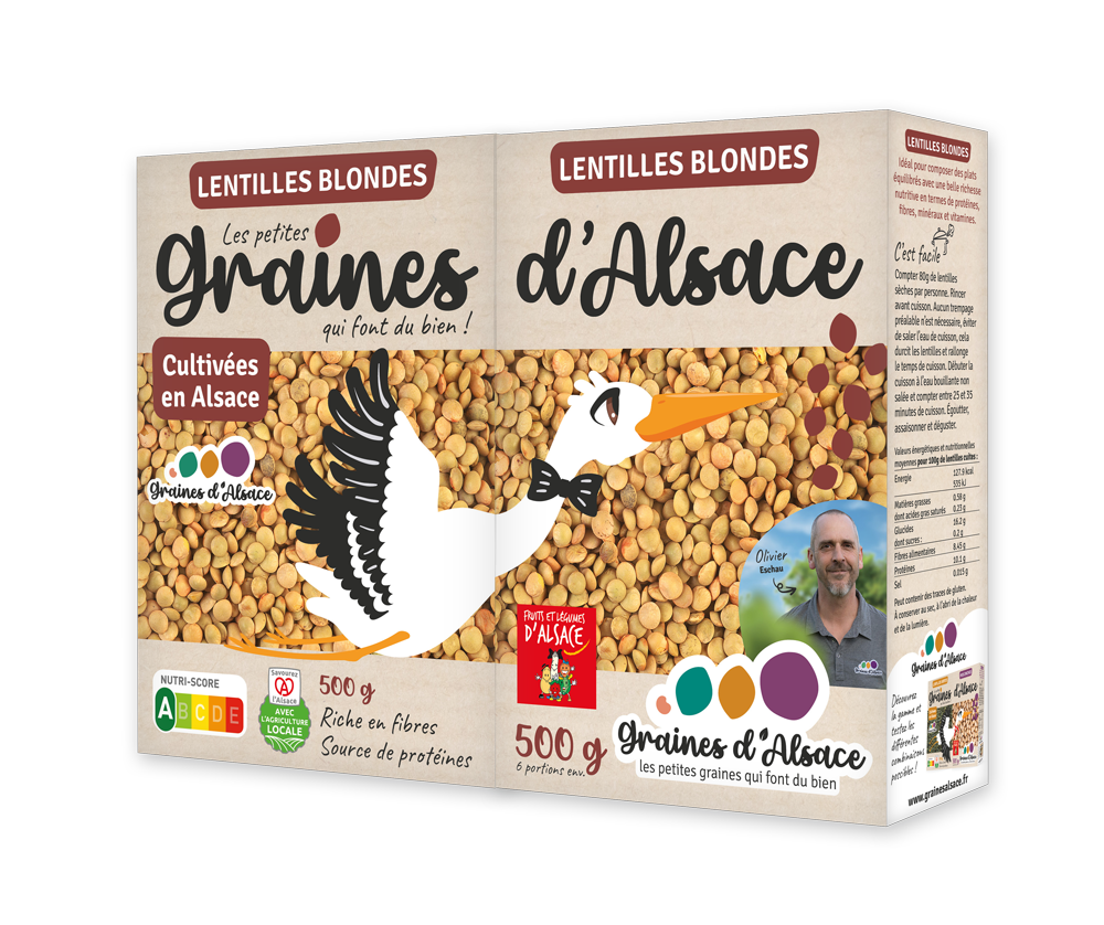 Sous la marque Graines d’Alsace, vous trouverez des lentilles vertes, des lentilles corail, lentilles blondes, du quinoa et des pois chiches. Les lentilles vertes, corail et les pois chiches sont conditionnés en boite de 500grs, le quinoa en boite de 400grs. Les lentilles vertes et corail, pois chiches et quinoa Graines d’Alsace sont des légumes secs dont vous retrouverez les conseils de préparation dans la présentation de chaque produit.