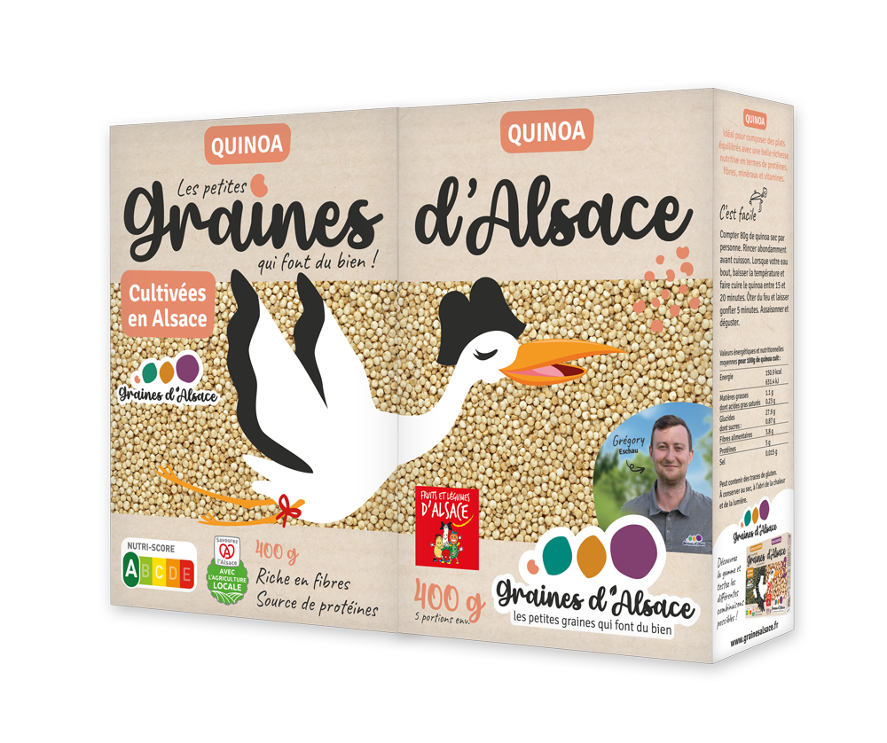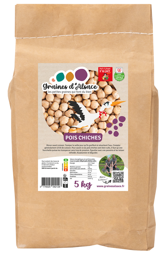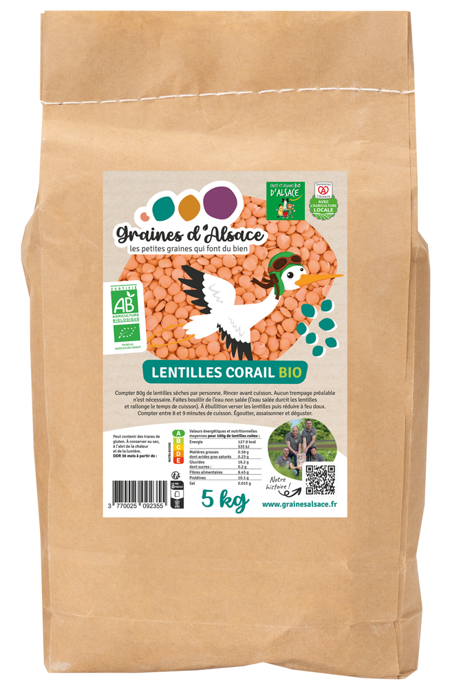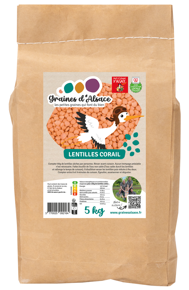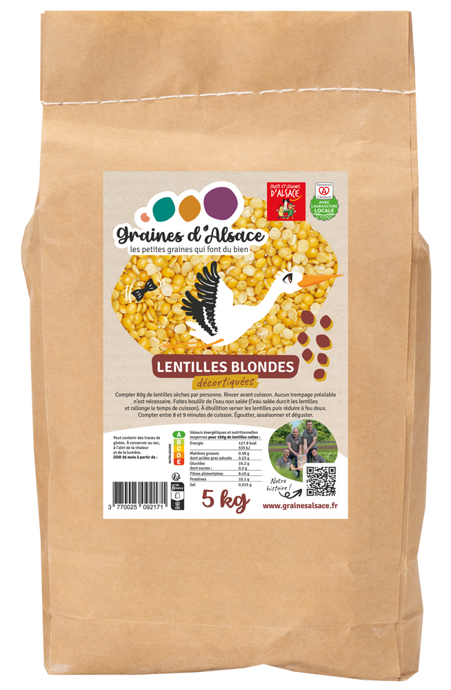 Sous la marque Graines d’Alsace, vous trouverez des lentilles vertes, des lentilles corail, lentilles blondes, du quinoa et des pois chiches. Les lentilles vertes, corail et les pois chiches sont conditionnés en boite de 500grs, le quinoa en boite de 400grs. Les lentilles vertes et corail, pois chiches et quinoa Graines d’Alsace sont des légumes secs dont vous retrouverez les conseils de préparation dans la présentation de chaque produit.